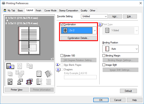 In [Combination] in the [Layout] tab, select "N e N". For example, when you select [2 e 2], one page of the original image is enlarged, divided, and printed on four sheets.