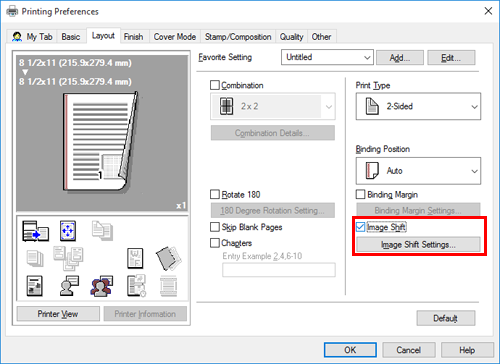 You can fine tune the image position by shifting it in a horizontal or vertical direction according to the paper size. When an image is printed on the back side, you can also fine tune its position.