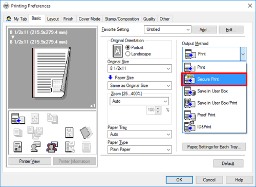 In [Device Option] of the [Configure] tab on the printer drive, set [Security Document Setting] to [Release Secure Print] (default: [Do Not Release Secure Print]). For details on [Device Option], refer to Configuring the optional environment of this machine.