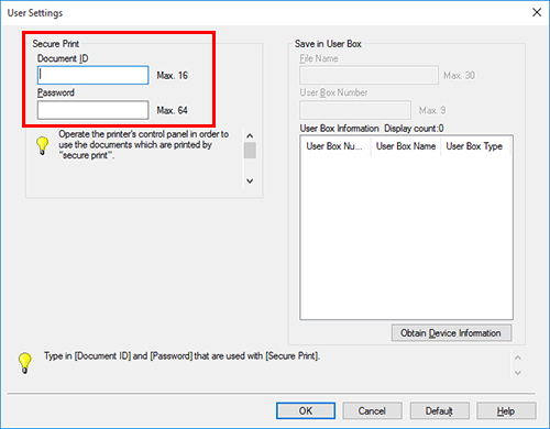 Data printed using the Secure Print function is saved in the Secure Print User Box. To print the saved data, you need to enter the document ID and password specified in the printer driver.
