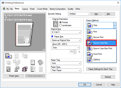 The Save in User Box function saves print data in a User Box on this machine. You can also print the data at the same time as it is being saved in the box.