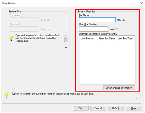 The box number can be checked in the [User Box Information] list. Clicking [Obtain Device Information] obtains the latest information of the box registered in this machine and displays it in the [User Box Information] list.
