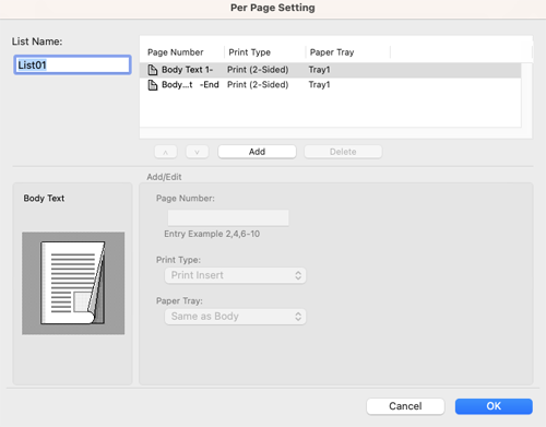 Create in advance a list that specifies the paper and print settings for each page. When printing on inserted paper, select the list you want to apply to printing.