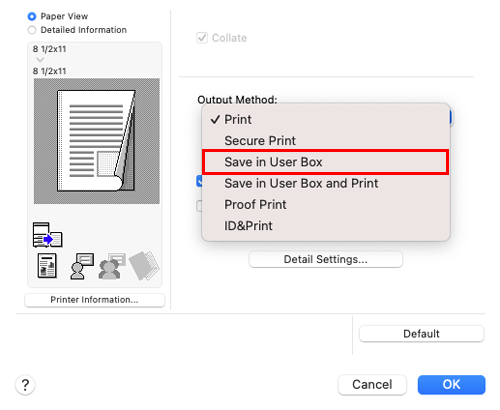 The Save in User Box function saves print data in a User Box on this machine. You can also print the data at the same time as it is being saved in the box.
