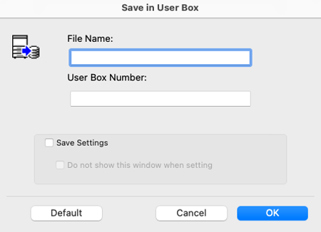 When the [Save Settings] check box is selected, the settings are saved. When the [Do not show this window when setting] check box is selected, this dialog box is not displayed next time. If you always use the same file name and box number, selecting this check box eliminates the need to enter them each time.