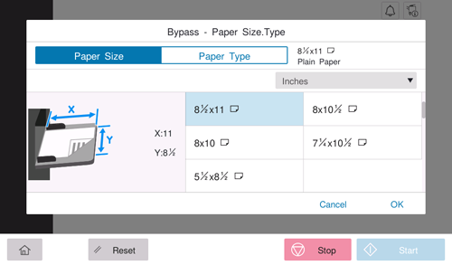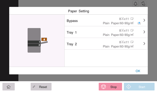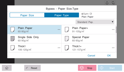 ) in [Plain Paper] of [Paper Type], and set to [Alter Thickness ON]. The paper tray set to [Alter Thickness ON] is placed to a low priority level among the paper trays in which plain paper is loaded. However, if [Alter Thickness ON] is set to all paper trays, the appropriate paper tray is selected based on the priority sequence specified in [Utility] - [Utility] - [System Settings] - [Auto Paper Tray Selection Settings].When loading custom-sized paper, directly enter the length and width of paper.