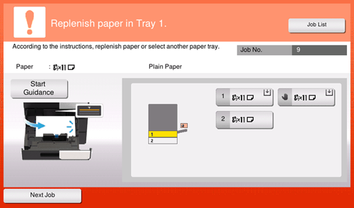 If a paper-out occurs during printing, a message appears to prompt you to add paper. Check the paper size and type, and add paper into the tray or select another tray.
