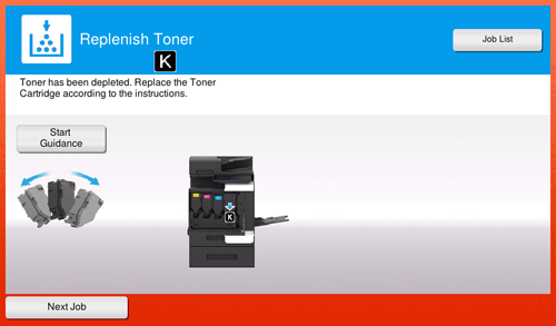 When it is time to replace a Toner Cartridge, a replacement prompt message appears. Replace it based on the maintenance contract. You can tap [Start Guidance] to display the replacement procedure on the screen and check it.