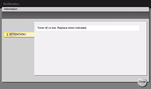 When it is almost time to replace a Toner Cartridge, an advanced warning message appears. Prepare a Toner Cartridge for replacement based on the maintenance contract.