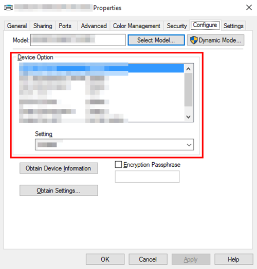 Because the [Auto] of [Obtain Settings...] by default, the current information of this machine is obtained automatically and reflected on the [Device Option].