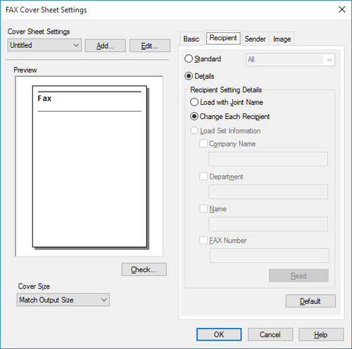 [Change Each Recipient] | This option changes the information written on the cover sheet for each recipient. Enter the contents of [Recipient List] displayed in the [FAX Transmission Popup] screen. You can create different cover sheets for up to 100 recipients. | |