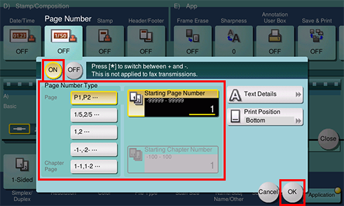 To add page numbers, tap [Page Number] in [Application] of scan mode of classic style, and set [Page Number Type] and [Starting Page Number]. If you have selected [Chapter Page] for [Page Number Type], specify the chapter number to start printing in [Starting Chapter Number].