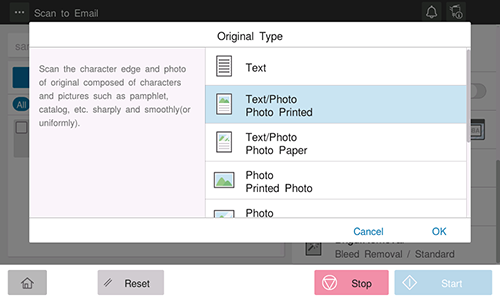When setting the image quality, select [Original Type] on the Scan screen, and select the image quality that matches the contents of the original to be scanned.