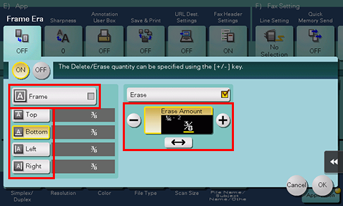 Tap [Frame Erase] in [Application] of scan mode of classic style. To erase all of the four sides of the original by the same width, set [Frame] to ON, and specify the width to be erased. To specify the width of the frame to be erased individually, set [Frame] to OFF, select a target side, then specify the width to be erased. When specifying the erase width individually, you can set to exclude a side from erasing by selecting the side and canceling the setting of [Erase] for that side.