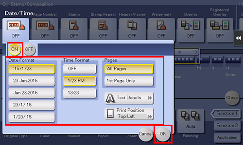 If the date/time, page number, and stamp are difficult to see with the default settings, tap [Text Details] on each of the [Date/Time], [Page Number], and [Stamp] setting screens; you can set the text size and font type. If the date and time, page numbers or stamp are over the text of the original, tap [Print Position] in each of the [Date/Time], [Page Number] and [Stamp] setting screens to set the printing positions.