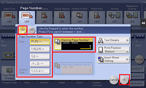 To add page numbers, tap [Page Number] in [Application] of copy mode of classic style, and set [Page Number Type] and [Starting Page Number]. If you have selected [Chapter Page] for [Page Number Type], specify the chapter number to start printing in [Starting Chapter Number]. When copying with covers, you can set the page numbers to be printed on the covers using [Insert Sheet Setting].