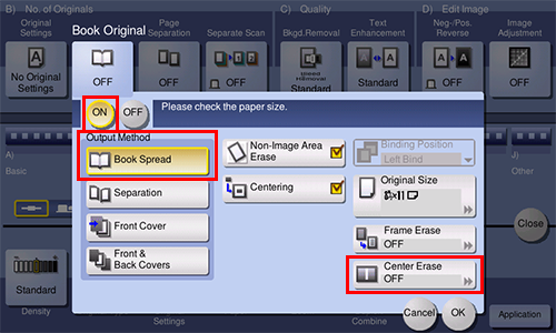 If you are using classic style, tap [Book Original] in [Application] of copy mode, and select [Book Spread]. Set [Center Erase] to [ON], and enter the width of the fold lines to be erased.