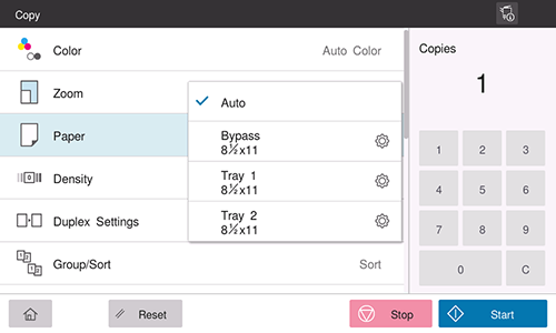 Select [Paper] on the Copy screen, and select the tray loaded with the paper you want to enlarge or reduce.