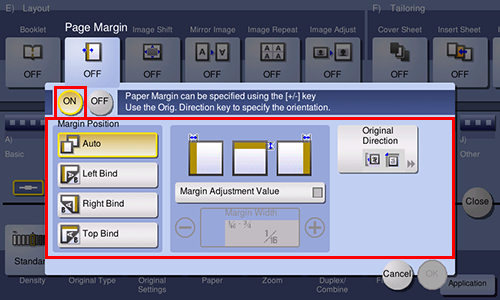 Tap [Page Margin] in [Application] of copy mode of classic style, and set the binding margin. To perform copying on both sides of the sheet, set [Margin Position] and [Original Direction] to ensure that the original is copied in the correct vertical orientation.