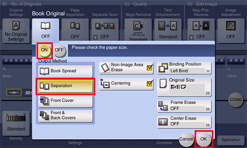 Tap [Book Original] in [Application] of copy mode of classic style, and select [Separation]. When paper is set to [Auto], a message appears to notify that the paper tray will be switched. Tap [Yes].
