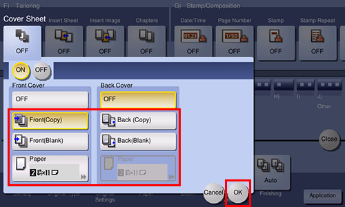Tap [Cover Sheet] in [Application] of copy mode of classic style, and set the front and back covers.
