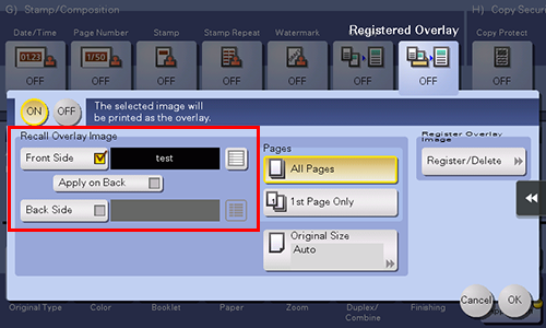 To overlay the registered image on the original image when copying, specify the surface on which the image is to be overlaid with [Registered Overlay], and tap the list icon (
