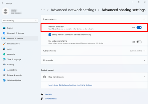 Before installation, open [Settings] from the Windows Start menu, and check that [Network discovery] is set to ON in [Network and Internet] - [Advanced network settings] - [Advanced sharing settings].