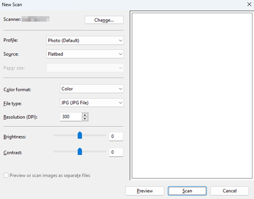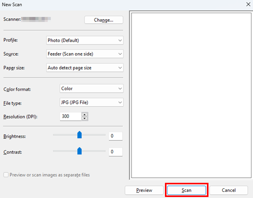 If you select [Flatbed] in [Source], click [Preview] before saving data as a file, and check the image of the scanned original.