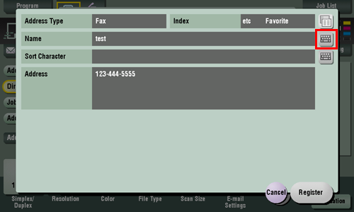 [Name] | Enter the destination name to be displayed on the Touch Panel (using up to 24 characters). Assign a name that helps you easily identify the fax number. |