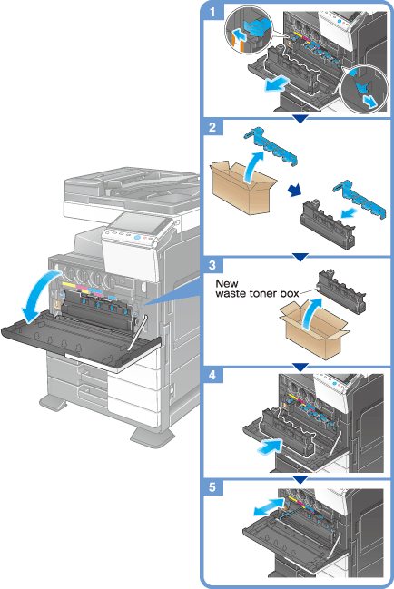 After replacing a Waste Toner Box, be sure to clean the Electrostatic Charger Wire for each color. For details on how to clean the Electrostatic Charger Wire, refer to Here.