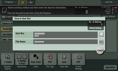 Select a user box to save scanned original data in the user box of this machine. If necessary, change the file name to save it.