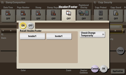 [Check/Change Temporarily] | If necessary, check or temporarily change the details of the program that is selected in [Recall Header/Footer].