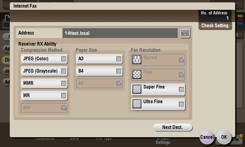 [Receiver RX Ability] | Sets the [Compression Method], [Paper Size], and [Fax Resolution] properties of original data that the destination machine can receive. |