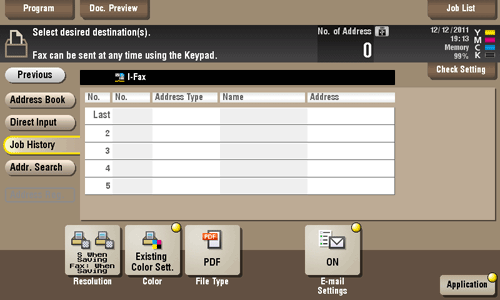 Tap [Job History], and you can select a destination from the scan or fax history. The latest jobs (up to five) are displayed for history purposes. When necessary, multiple destinations can be selected from the history.