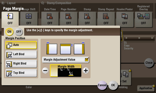 • [Auto]: The binding direction is automatically set. When the long side of the file is 11-11/16 inches (297 mm) or less, the binding position is set to the long side of paper. When the long side of the file exceeds 11-11/16 inches (297 mm), the binding position is set to the short side of paper.