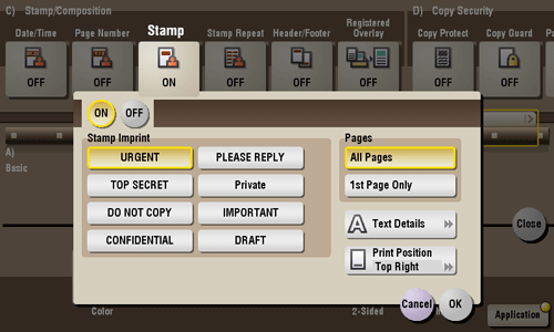 Text such as "PLEASE REPLY" and "DO NOT COPY" are printed on the first page or all pages. You can select the text to be printed from the registered fix stamps and arbitrary registered stamps.