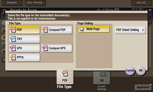 [PDF Detail Setting] | If [PDF] or [Compact PDF] is selected for file format, you can configure the PDF option settings. You can enhance security by attaching a digital signature that identifies the author of the file, by file encryption, etc. For details, refer to Here. |