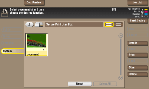 When you print a document from the PC or when you select the Secure Print function using the printer driver, this data file is stored in the Secure Print User Box. Once you have opened the User Box, you can select a file stored in the User Box and preview, print, rename, or delete it.
