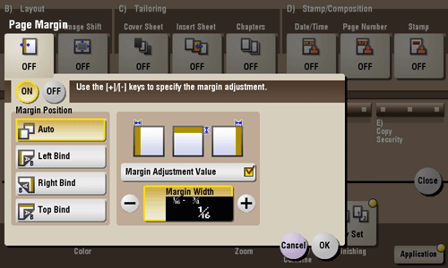 [Margin Adjustment Value] | Adjust page the margin in the range 1/16 inch to 3/4 inch (0.1 mm to 20.0 mm). Adjust it by tapping [+]/[-] for the inch area, or by tapping [+]/[-] or pressing the Keypad for the centimeter area. |