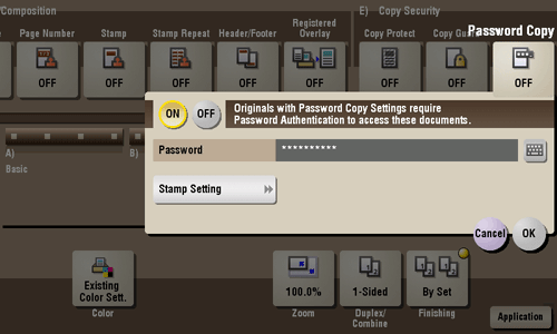 Password Copy is a copy protection function that prints concealed security watermarks such as "Private" or a date in the background to prevent unauthorized copying, and embeds a password for the password copy function on all printed sheets.