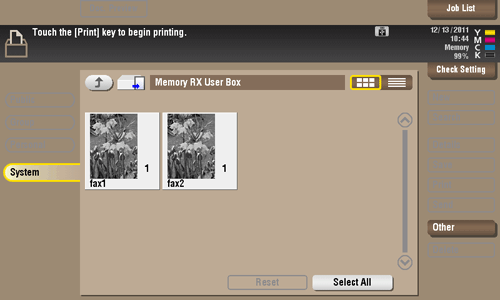 When a facsimile is received by the Memory RX function, it is stored in the Memory RX User Box. Once you have opened the User Box, you can select a fax stored in the User Box and preview, print, rename, or delete it.