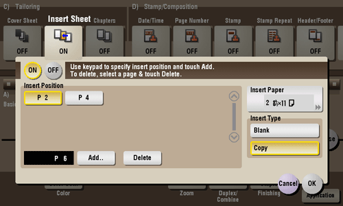 [ON]/[OFF] | Select [ON] to specify Insert Sheet. |
