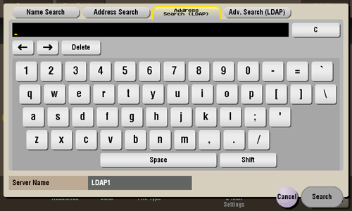 In the LDAP server or Windows Server Active Directory is used, specify a single keyword to search for an E-mail address or fax number.