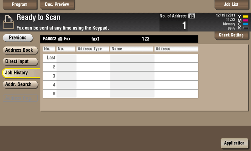 Select a destination from the Job History. The latest jobs (up to five) are displayed for history purposes. When necessary, multiple destinations can be selected from the history.