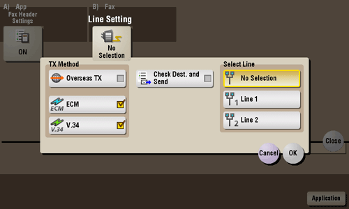 [Select Line] | If two lines are used, select the line used to send faxes. If [No Selection] is selected, either line, whichever is not busy, is used for transmission. |