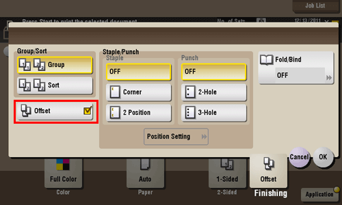 If the Finisher or Job Separator JS-506 is installed, the printed sheets are fed out and stacked on top of each other with each copy or page set staggered to separate them.