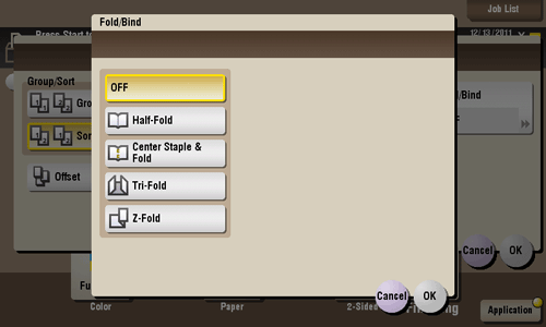 [Center Staple & Fold] | Staples and feeds out a printed sheet by folding it in two. For details, refer to Here. |