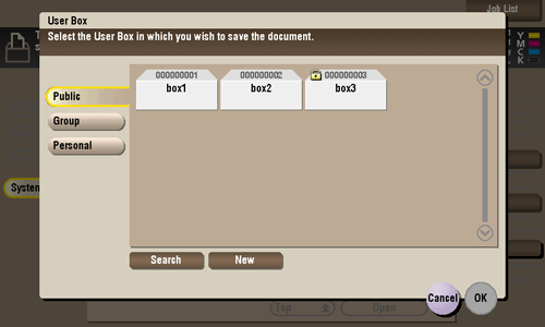 [Search] | This window is used to search for a User Box. The User Boxes are displayed based on search characters you have specified during box registration. You can also specify a User Box number directly from the Keypad. |
