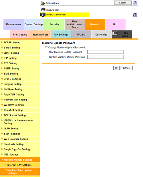 To automatically update configuration information of this machine, in the administrator mode, select [Network] - [Machine Update Settings] - [Machine Auto Update Settings] - [Machine Update Password], then enter the password to decode the encrypted configuration file (using up to 32 characters).