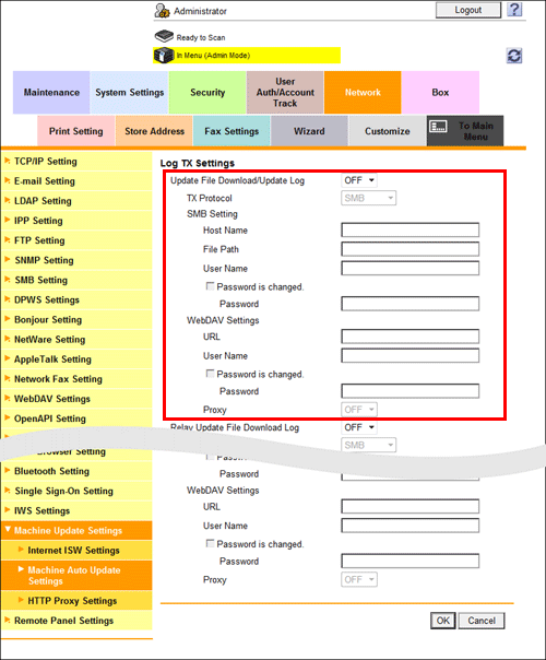 If necessary, in the administrator mode, select [Network] - [Machine Update Settings] - [Machine Auto Update Settings] - [Log TX Settings], then configure a setting to send firmware update logs.